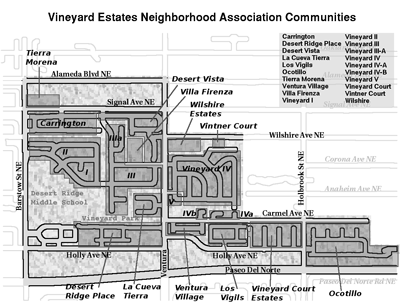 Boundaries Vineyard Estates Neighborhood Association encompasses all land within the City of Albuquerque that is bounded by Paseo del Norte on the south, Alameda on the north, Barstow on the west, and Eubank on the east.